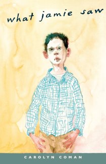In What Jamie Saw by Carolyn Coman, 9-year-old Jamie witnesses domestic violence and hides out with his mom. When a teacher visits him and his mom, and Jamie is told he must go back to school, this is how he reacts: